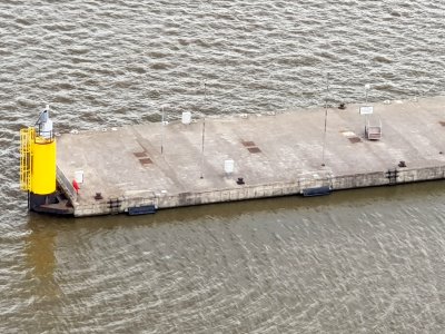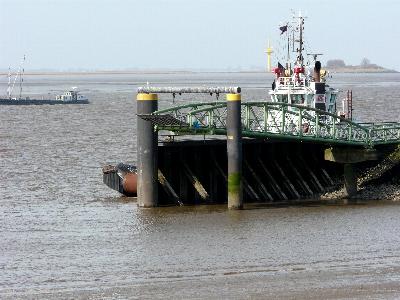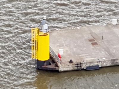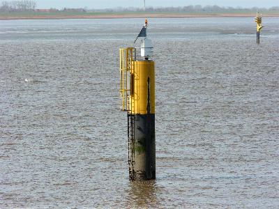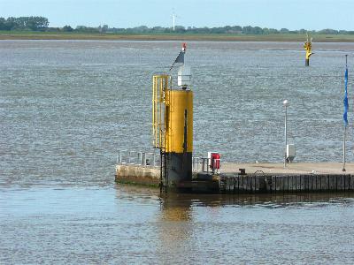 Bemerkung: Am südlichen Ende der Seebäderkaje befindet sich ein runder gelb gestrichener Stahlpylon, der in den Wesergrund gerammt wurde. Auf dem Mastende befindet sich ein runder Handlauf, in deren Mitte ist ein weißer Schaltkasten montiert. Auf dem Kasten sitzt sowohl der orange scheinende Scheinwerfer als auch das Solarmodul zur Stromgewinnung. Seitlich am Mast ist eine Steigleiter mit Absturzsicherung angebracht. Der Anleger wird in den eisfreien Monaten ausgesetzt, in den Wintermonaten wird der komplette Anleger demontiert. Die oberen beiden Bilder zeigen Feuer und Anleger, die beiden unteren Bilder nur das Feuer, der Anleger ist bereits demontiert. Hier legte bis vor ein paar Jahren das Bäderschiff nach Helgoland an. Doch wurde diese Linie eingestellt, das Einschiffen nach Helgoland erfolgt nun von Cuxhaven oder Wilhelmshaven.