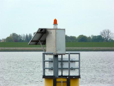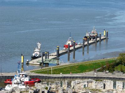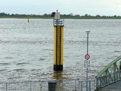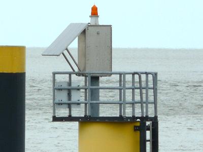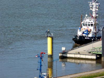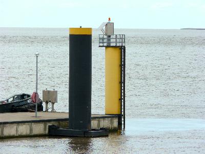 Bemerkung: Runde gelb gestrichene Stahlpylone im Grund des Flusses gerammt. Seitlich befindet sich eine Steigleiter, von der aus man auf die Plattform der Säule gelangt. Diese ist mit einem Handlauf umrandet. Am Handlauf befestigt ist ein weißer Schaltkasten, auf dem der orange strahlende Scheinwerfer sitzt, seitlich befindet sich ein Solarmodul zur Stromgewinnung. Dieses Feuer befindet sich sowohl auf der Nord- als auch auf der Südseite des Anlegers für die Schlepper. Der Schlepperanleger befindet sich direkt im Anschluß an der neuen Sportbootschleuse Bremerhavens.