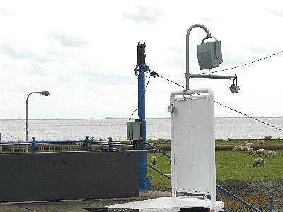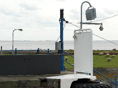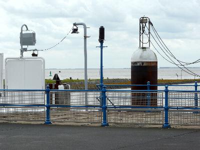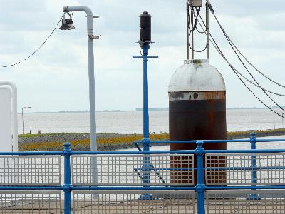 Mast in dem fortlaufenden Handlauf der Seeschleuse integriert. Dieses Feuer