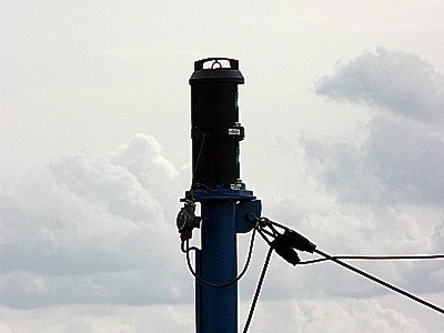 Mastspitze aufgesetztem grün strahlendem Doppelscheinwerfer. Seitlich am